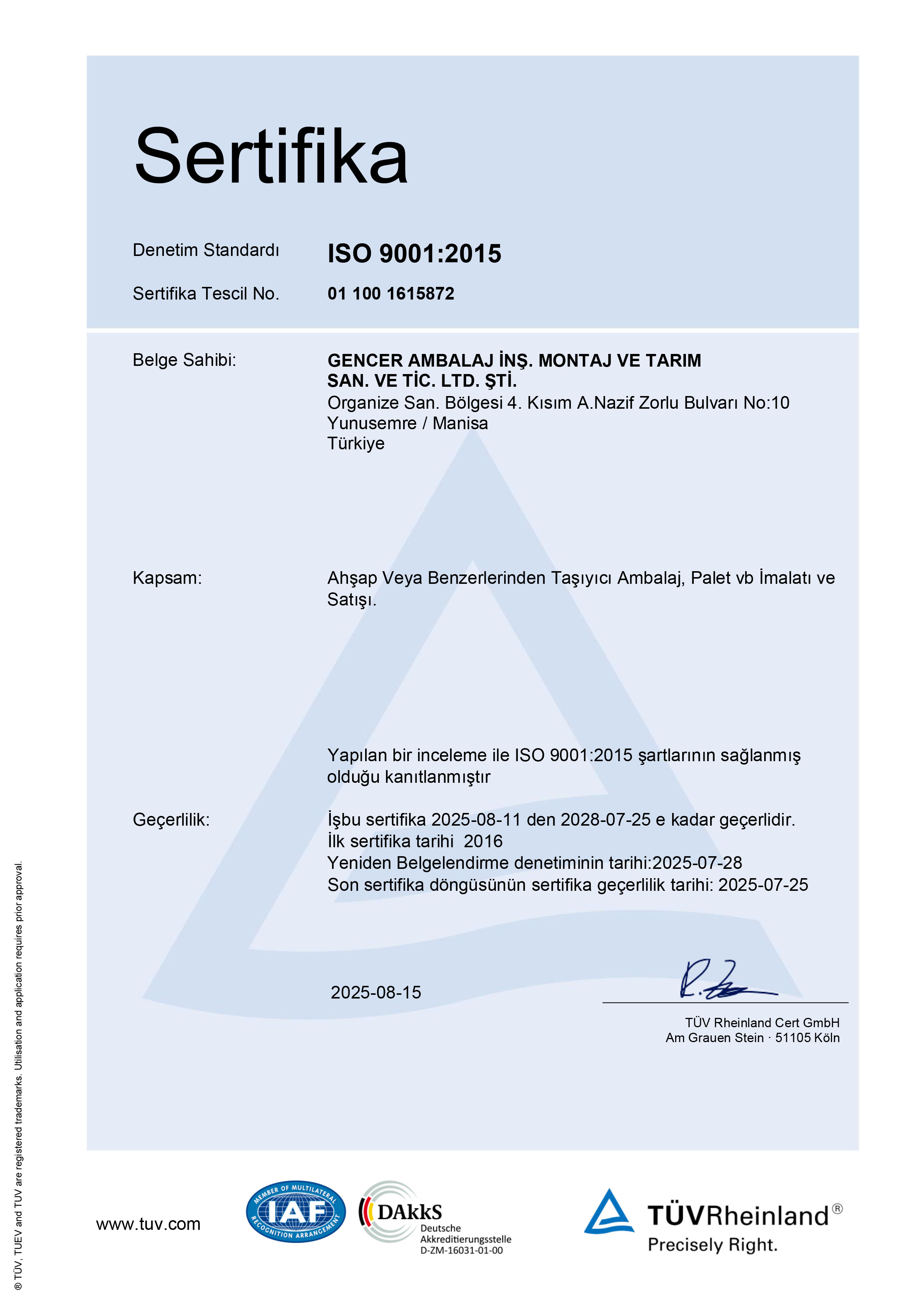 Gencer Ambalaj, TR-057 lisans numarası ile EPAL Üretici Lisansı 'na sahiptir.