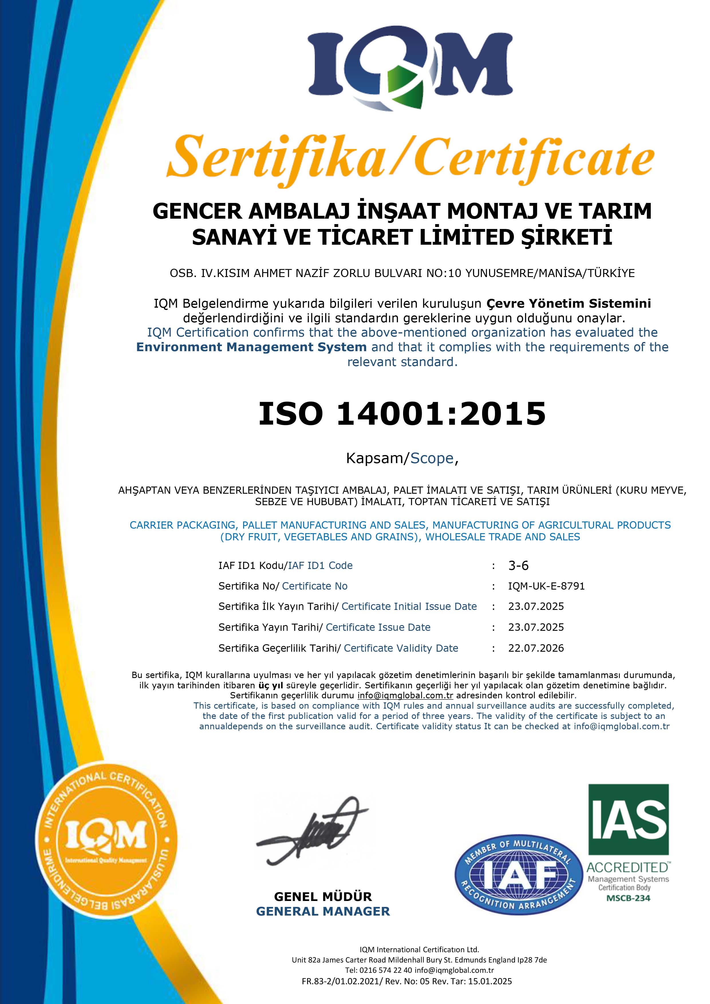 Gencer Ambalaj, ISO 14001 Çevre Yönetim Sistemi ile ürünün, hammaddeden başlayıp nihai ürün haline getirilerek müşterilere sunulmasına kadar geçen sürecin her aşamasında çevresel faktörlerin belirlenmesi ve bu faktörlerin gerekli muayeneler ve önlemler ile kontrol altına alınmasını sağlamaktadır.