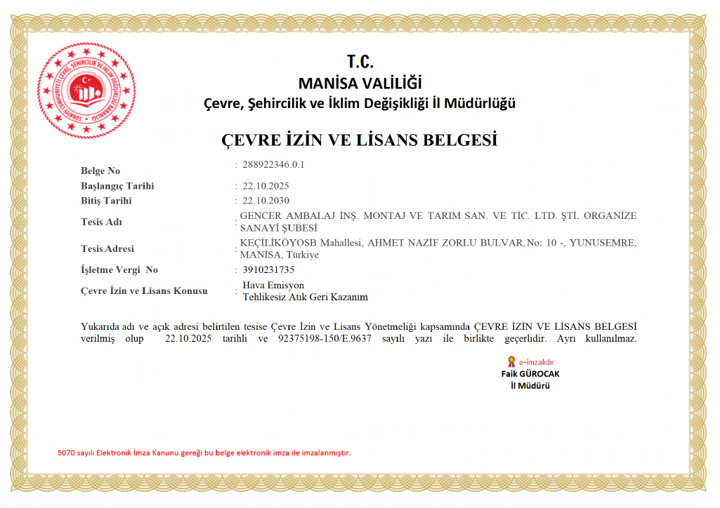 Gencer Ambalaj olarak, “Hava Emisyon” ve “Ambalaj Atığı Geri Kazanım” konularında çevre izin ve lisans yönetmeliği kapsamında faaliyet belgemiz bulunmaktadır.