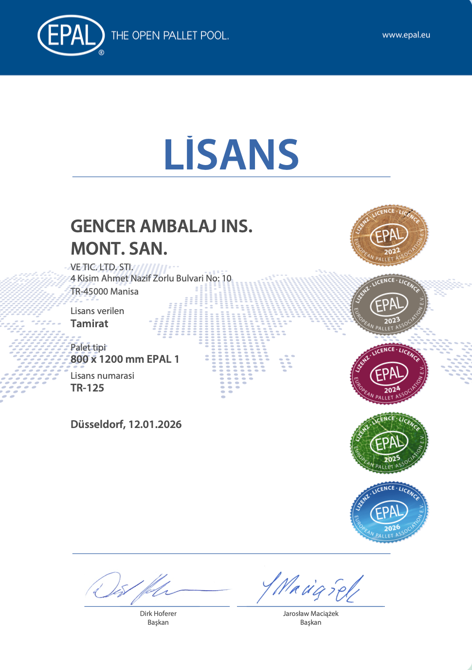 Gencer Ambalaj, TR-125 lisans numarası ile EPAL Tamirat Lisansı 'na sahiptir.
